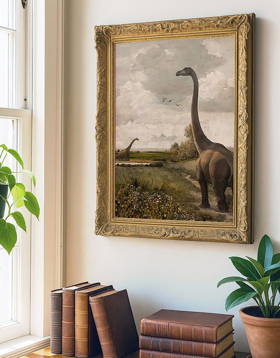 Brontosaurus in Neutral Antique Country Landscape, Dinosaur Prehistoric Art Print