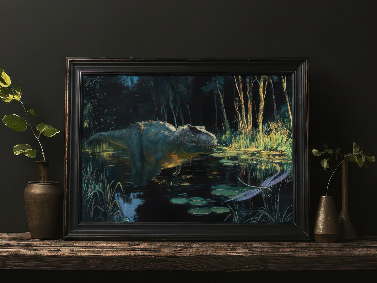 This tyrannosaurus rex dinosaur print is rendered in a loose, impressionistic manner, the scene is steeped in shadow, with a dense, nocturnal forest receding into darkness while muted teal, moss, and inky blue tones ripple across the water’s surface. Subtle highlights along the reptilian form catch faint glimmers of light, lending the creature a unique presence that feels both ancient and contemplative rather than ferocious. The overall composition leans strongly into a dark academia style.
