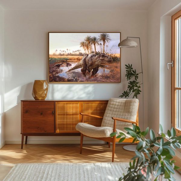 This desert tyrannosaurus painting landscape scene features shades of buff, ochre, taupe, and pewter. Its scrubby brushstrokes give a messy and muddied look to the palette, enhancing the rustic charm of the scene. A beautiful sunset illuminates the ancient past, adding a touch of warmth and tranquility to the artwork.