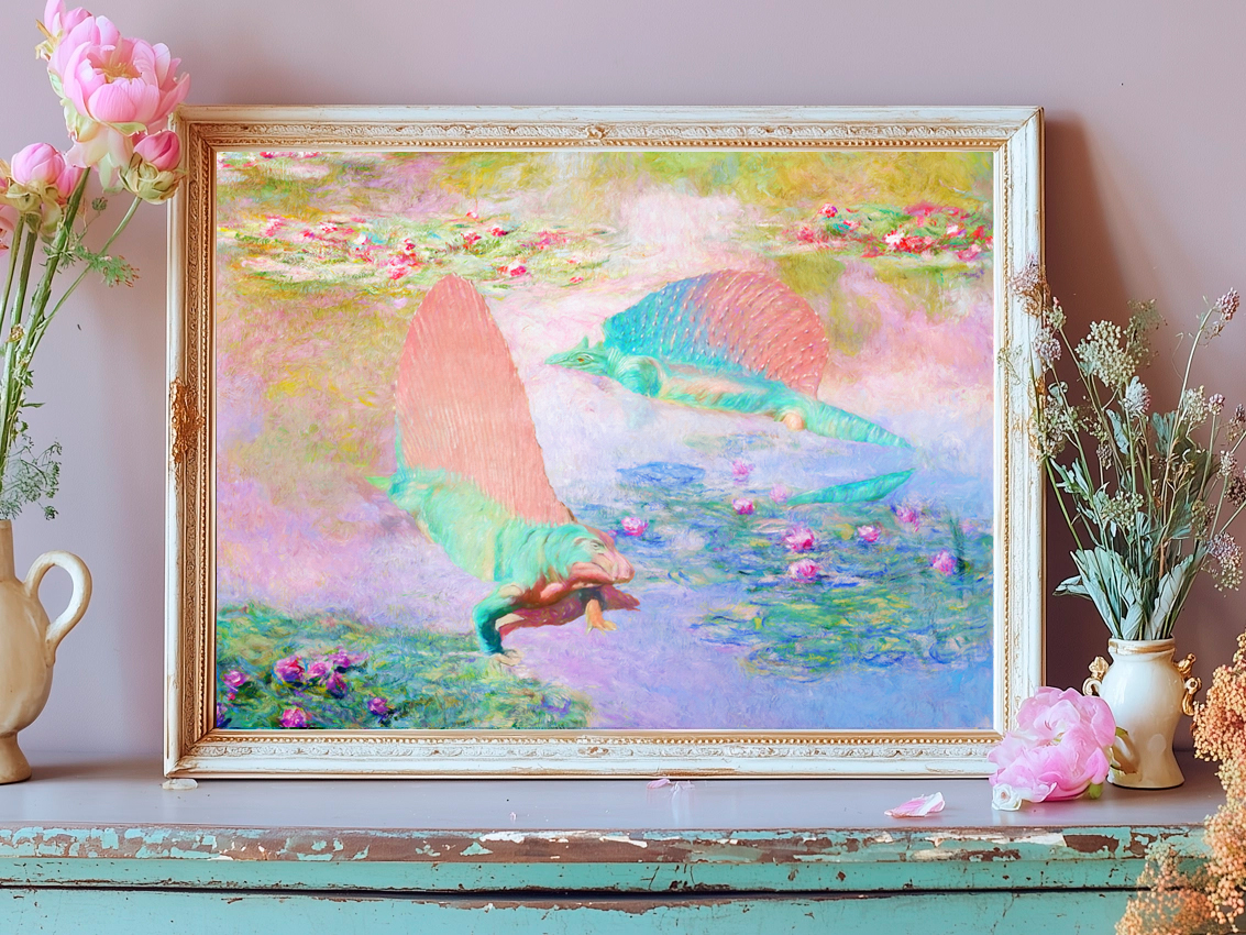 Pink Claude Monet Impressionist Dinosaur Art Print, Water Lilies Swamp, Childrens Bedroom Bathroom Artwork