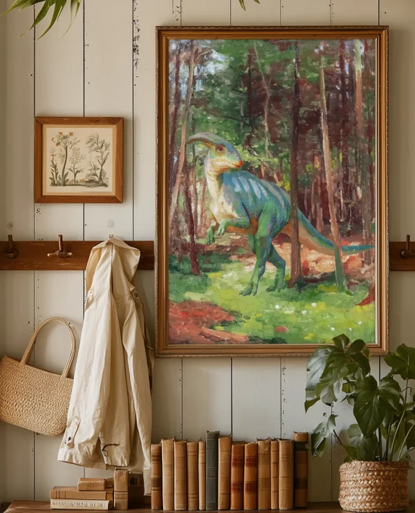 This Parasaurolophus dinosaur art print forest landscape print features a Parasaurolophus dinosaur standing peacefully among towering pine trees and lush green foliage. Soft sunlight filters through the canopy, casting warm highlights across the forest floor in shades of russet and moss, evoking a calm prehistoric woodland atmosphere. This dinosaur art print is ideal for both children and adults seeking a distinctive, nature-inspired statement piece for a study, living room, or hallway.